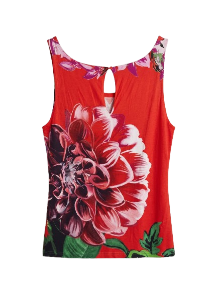 La camiseta Desigual 73T2WF9 es una explosión de vida para tus looks de verano. Con una base en un intenso y favorecedor rojo coral, esta prenda destaca por su estampado frontal de grandes flores exóticas y mandalas en tonos contrastados. Es la prenda perfecta para quienes no quieren pasar desapercibidas y buscan una camiseta que transmita alegría y personalidad en cada detalle.