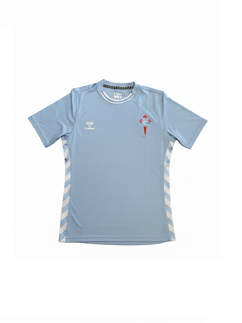 La camiseta de local del RC Celta 24/25 se presenta en azul claro con una sublimación gráfica de leyendas de la historia del club tanto en la parte delantera como en la trasera. La camiseta tiene un cuello especial de inspiración retro y tanto el logotipo de Hummel como la insignia del club se pueden ver en el pecho. Los galones de Hummel adornan los hombros, mientras que el logo del RC Celta está estampado en el cuello.